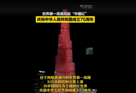 导读:当地时间10月1日晚,位于阿联酋迪拜的世界第一高楼——828米的哈利法塔上演以中国国庆为主题的灯光秀,庆祝中华人民共和国成立75周年。五星...