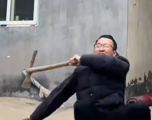 2月1日,山东菏泽。媳妇一声令下,为挣表现的女婿劈柴火一斧头被弹摔,丈夫娘的晾衣绳也“战损”。网友:#这不是干活是给丈母娘上才艺#。