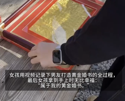 近日,一女孩订婚前收到男友用100克金条亲手打造的属黄金婚书,男友还承诺结婚还有更大惊喜。
