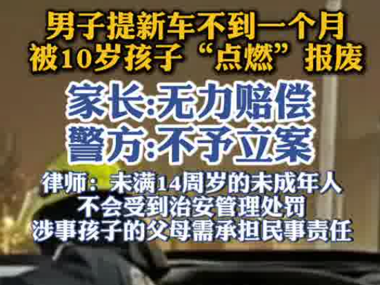 男子提新车不到一个月,春节期间被未成年人“点燃”报废,家长表示无力赔偿,警方:不予立案。律师:未满14周岁的未成年人不会受到治安管理处罚,涉事孩子的父母需承担民事责任。