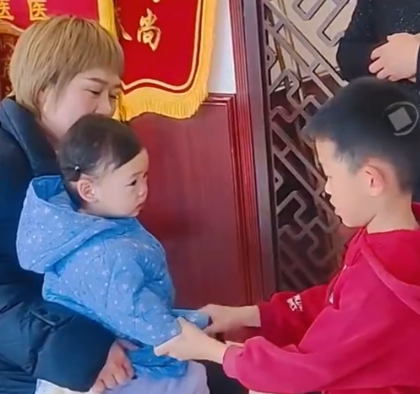 2月21日(采访),河北。一位宝妈带肘关节脱位的女宝去正骨,因为店老板比较忙,店老板8岁的儿子就替爸爸“接单”,手法非常娴熟,轻轻松松就为女宝复位成功。推拿正骨店的老板金先生说,“平时忙的时候,儿子就会帮忙,之前教过他,这已经不是第一次了,效果都还不错。