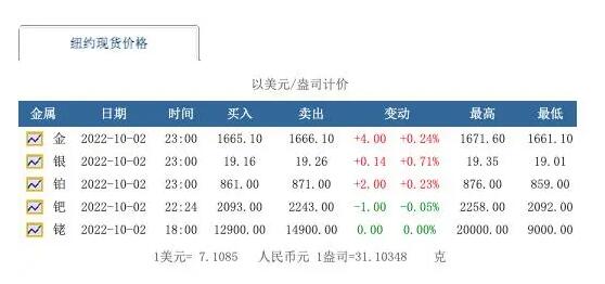 上游新闻查询贵金属交易权威平台金拓网得知,根据10月2日的最新市场报价,金属铑的现货买入价格约为3000元人民币/克,卖出价格约为3400元人民币/克。