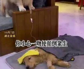 10月7日,湖北宜昌。金毛两兄弟情深,弟弟打吊针,哥哥给举药瓶。视频发布者表示:大狗六岁,小狗只有七八个月,平时它俩关系非常好,弟弟总粘着哥哥。