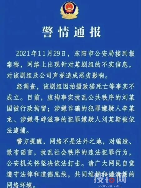 通报表示,网上盛传剧组虐猫一事子虚乌有,有关部门已依法对造谣传谣的刘某和李某进行了相应的处罚,并提醒网友:网络不是法外之地,造谣传谣扰乱社会秩序,是违法行为。