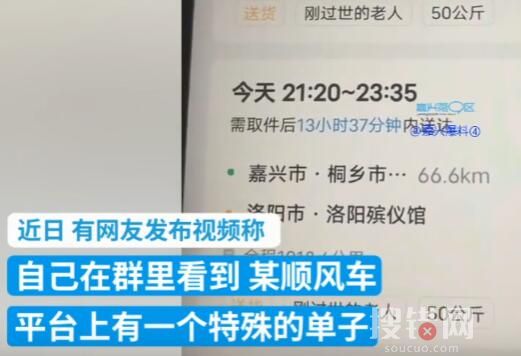 近日,有网友称某顺风车平台上有一个订单,从浙江桐乡殡仪馆到河南洛阳殡仪馆运送遗体,出价756.6元(含感谢费300元),并标记“刚过世的老人”,“50公斤”字样。