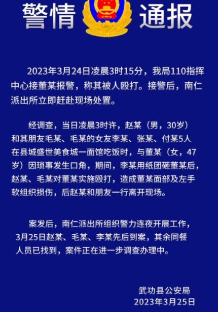 3月24日,在陕西咸阳武功县一美食城内,一名女子被几名男子追着殴打引发关注。3月25日,武功县公安局通报,3月24日凌晨3时15分,该局110指挥中心接董某报警,称其被人殴打。接警后,南仁派出所立即赶赴现场处置。
