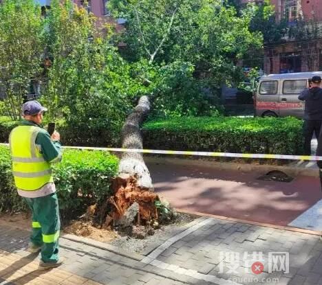 “小广场前有四棵大树,部分树干早已干枯,去年,东边的那棵就被刮掉了一截主干,还砸坏了两辆车。这回是西边的这棵断了,幸好树下没有行人和车辆。真希望相关部门能把这些朽木清理干净。”这位商户说。