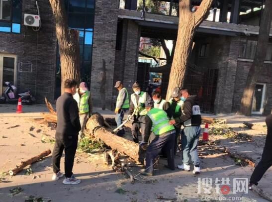 一位商户介绍,中午时分,突然听到咔嚓一声,跑出来一看,广场西边的那棵大树的一截主干被风刮断了,十多米长的树干向南砸到了路边,他们连忙报了警。不一会儿,区园林局绿化队的工人和作业车就到了,把砸在地上的大树干截成数节,又开始清理树上的干枝。